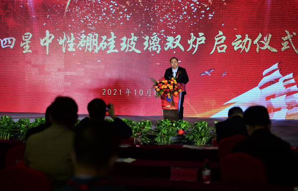 中國生化制藥工業(yè)協(xié)會常務副會長胡文言在致辭中講到,四星玻璃作為全球大規(guī)模生產(chǎn)中性硼硅玻璃能量產(chǎn)的企業(yè)少數(shù)幾家大概是三家四家企業(yè)之一,掌握了獨到的技術(shù),是我們國家的幸運,是人民的需求。 2021年工信部已經(jīng)確定了滄州四星玻璃是我們國家級的專精特新小巨人企業(yè),四星玻璃為疫苗生產(chǎn)貢獻了數(shù)億支疫苗瓶,成為了民族脊梁,是防治新冠疫情的功臣,是我們的驕傲。滄州四星這個5號,6號窯爐雙爐啟動,也是解決眼門前的這個巨大的需求,為這個需求做出了重大的貢獻。